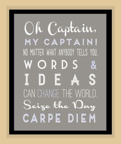 “They’re not that different from you, are they? Same haircuts. Full of hormones, just like you. Invincible, just like you feel. The world is their oyster. They believe they’re destined for great things, just like many of you, their eyes are full of hope, just like you. Did they wait until it was too late to make from their lives even one iota of what they were capable? Because, you see gentlemen, these boys are now fertilizing daffodils. But if you listen real close, you can hear them whisper their legacy to you. Go on, lean in. Listen, you hear it? – – Carpe – – hear it? – – Carpe, carpe diem, seize the day boys, make your lives extraordinary.”- John Keating, Dead Poets Society