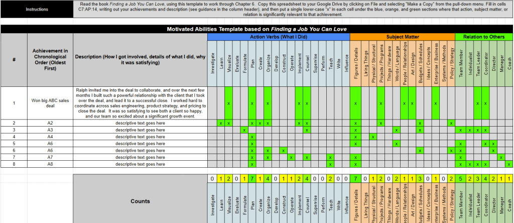 Based on the exercise, which I found valuable, I created this Simplified SIMA Template in Google Sheets — you can copy this template into your Google account, and then fill in stories from your life where you felt joy, success, and/or satisfaction, and then analyze those to see what patterns emerge. I found this so useful while reflecting on my next chapter of life!