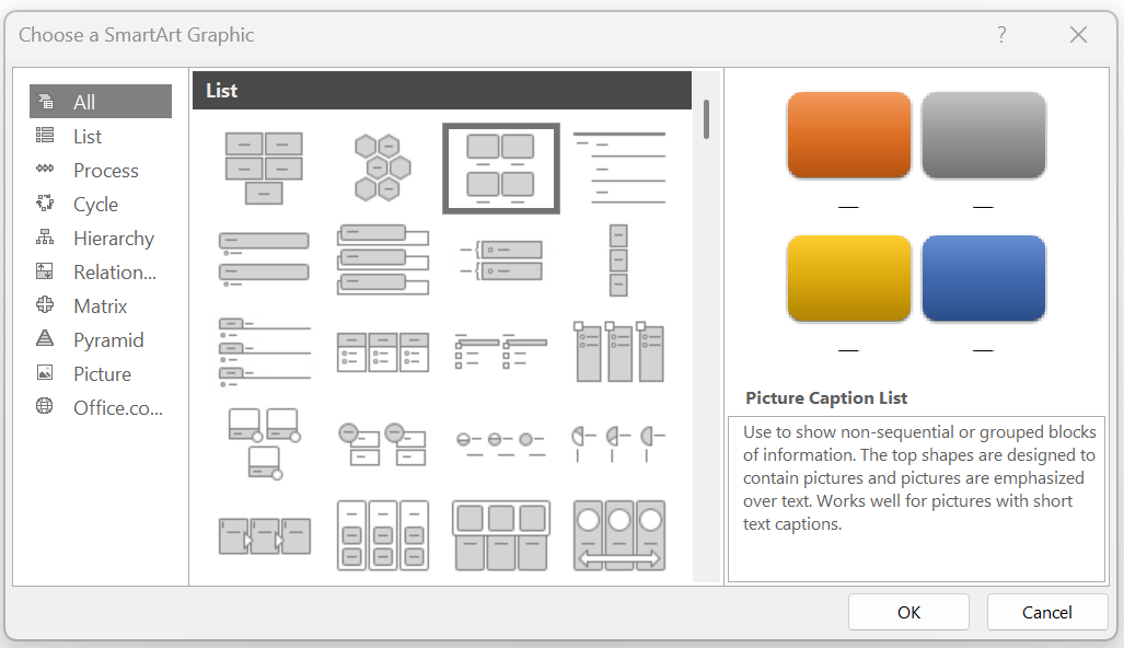 - Click the down-arrow icon in the "Layouts" section, and click on different SmartArt layouts to see how the graphic could work, trying different layouts until you feel inspired