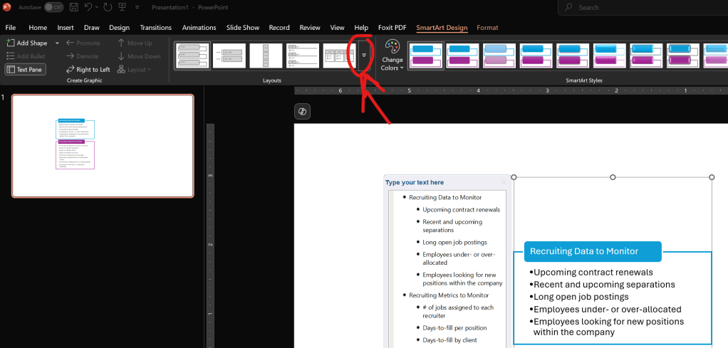 - Click on the graphic you made, and click on "SmartArt Design" (ribbon tab in top-center)