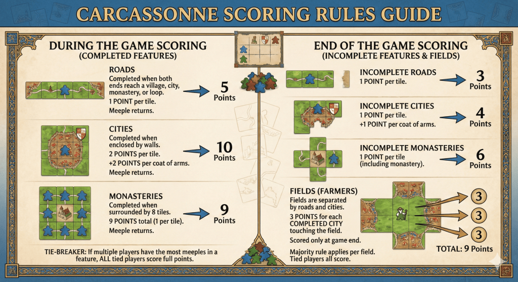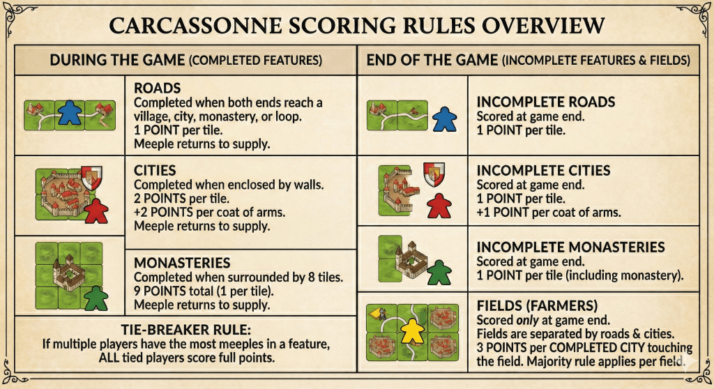 Please create a nice one page graphic that shows the scoring rules for the game Carcassonne