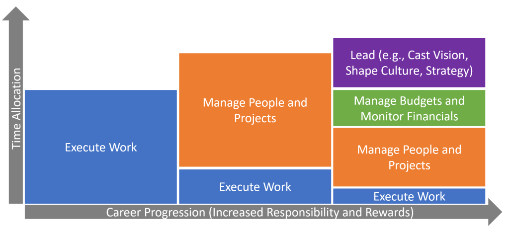 A great mentor and family friend of mine (Thanks Tim!) once explained to me that the progress is Managing Things (e.g. tasks), then Managing People, and finally Managing Money. Early in my career, I was fascainating by engineering and had zero interest in business, so I was surprised/irritated to hear this from him, but it's so true that understanding leadership and managemnt of people and how money works within your organization (such as planning/budgeting, approvals, financial monitoring, rewards/incentives) are powerful ways to move up in your career quickly. Another model I've heard is moving from Doing to Managing (Operations, Structure, Processes, Execution) to Leading (Strategy, Vision, Culture). Here's how I think about this progress conceptually: