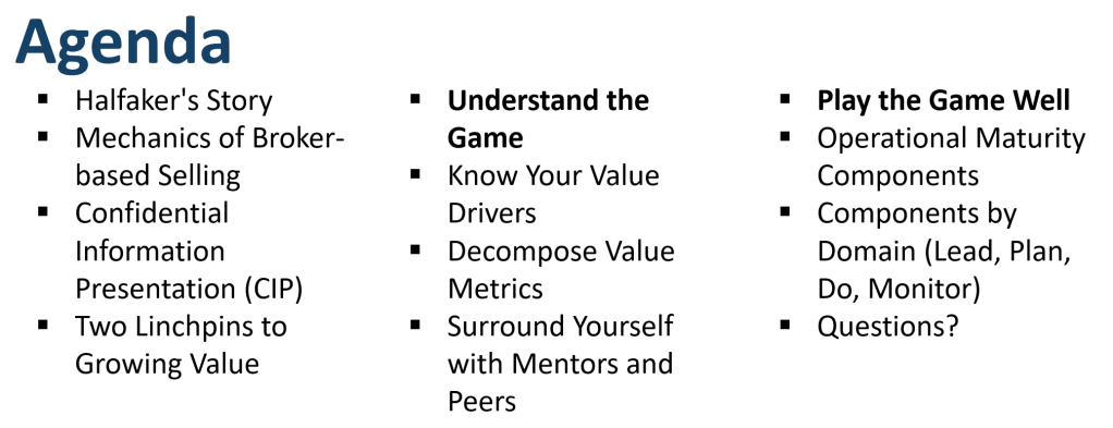 The presentation shares our journey at Halfaker and Associates through acquisition, then discuss some significant enterprise value drivers, and then some recommendations and ideas on how you can build a company to pursue those value drivers.