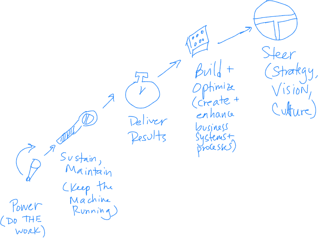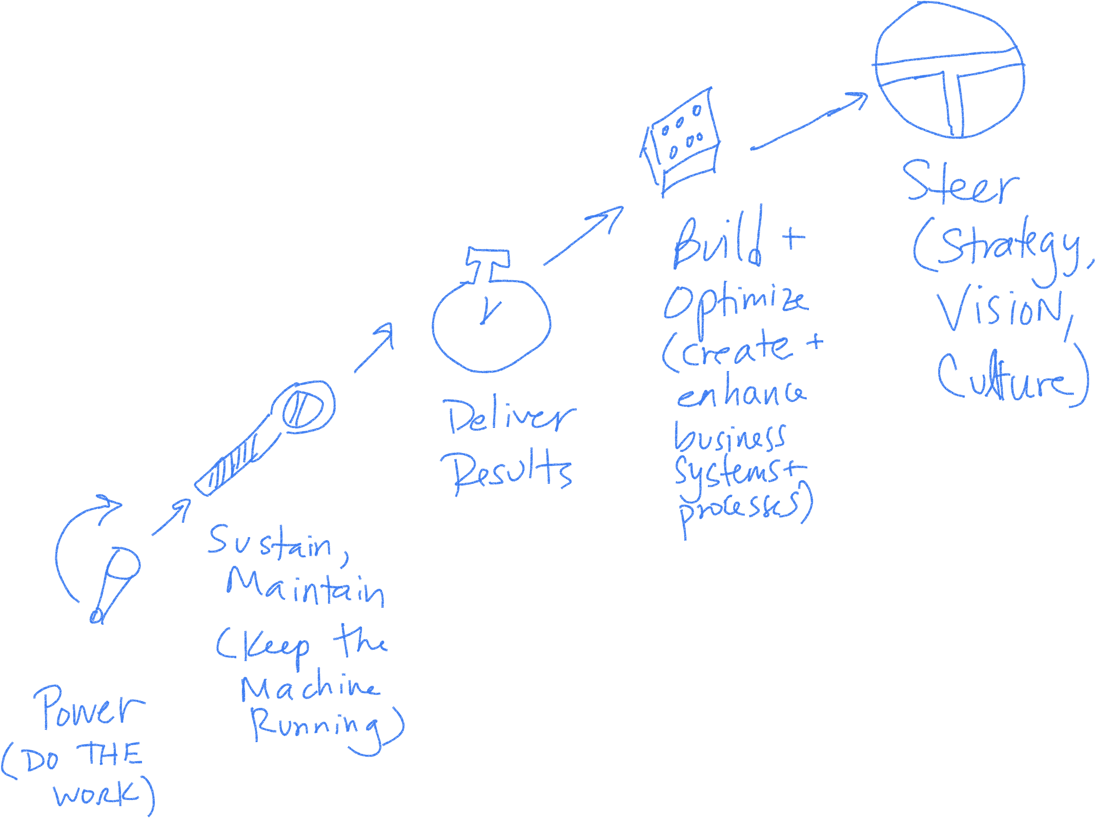 - Senior Leaders build and optimize the business systems (not IT systems, but the "business architecture" of how parts of the business run -- things like business processes, checklists, cultural expectations, forms, templates)