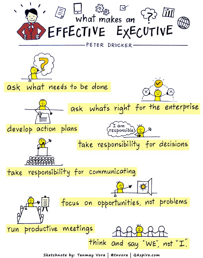 Zooming in more on the executive/senior leadership role, below is an amazing visual summary of Peter Drucker's Effective Executive (book and HBR article) concepts by Tanya Vora: