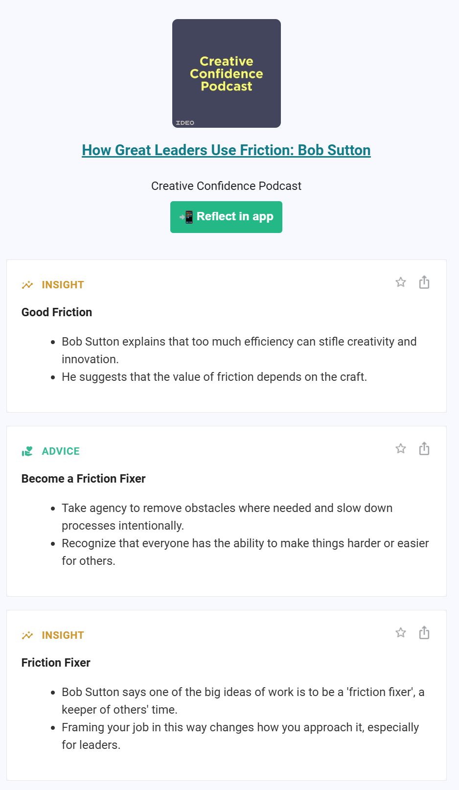 - Allows you to chat with podcast episodes. As an example, below is a screenshot of a section from a recent email snipd sent me, after I listened to a great podcast about friction and design