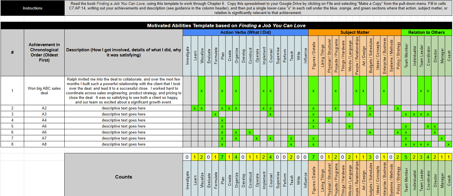 Based on the exercise, which I found valuable, I created this Simplified SIMA Template in Google Sheets -- you can copy this template into your Google account, and then fill in stories from your life where you felt joy, success, and/or satisfaction, and then analyze those to see what patterns emerge. I found this so useful while reflecting on my next chapter of life!